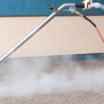 A wet vacuum extracts dirt and moisture. Sanitizer or steam may be applied for deep hygiene and odor removal.