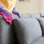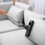 A vacuum cleaner is used to remove dust, hair, and loose dirt from the surface, corners, and under cushions.